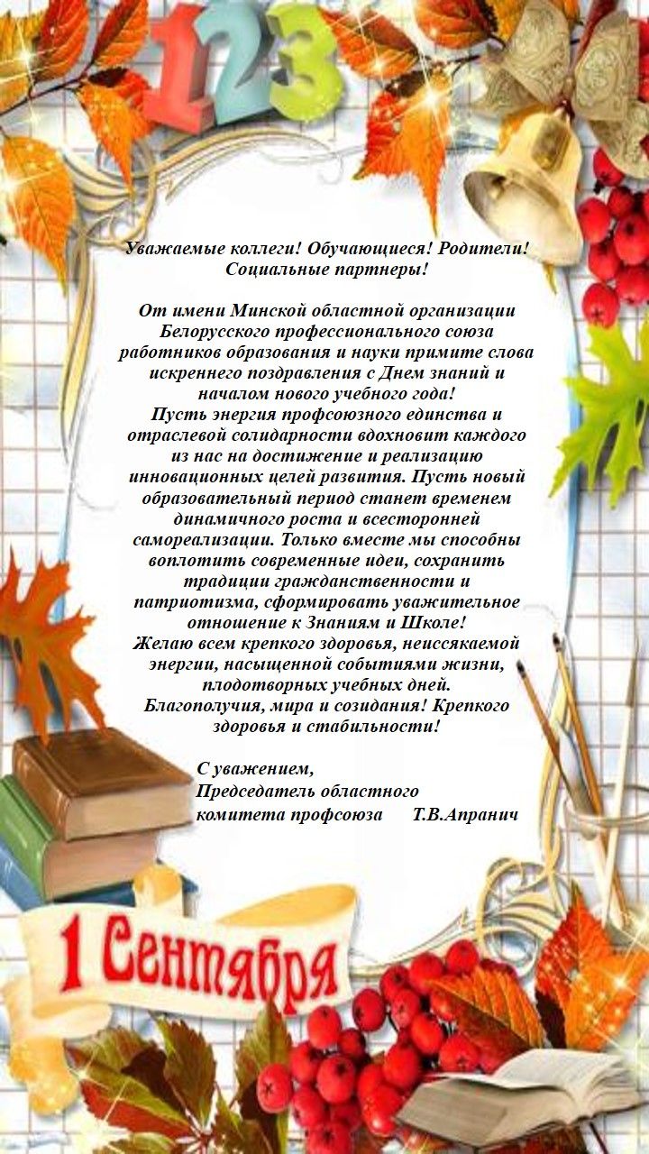 Поздравление от Минской областной организации Белорусского профсоюзного союза работников образования и науки