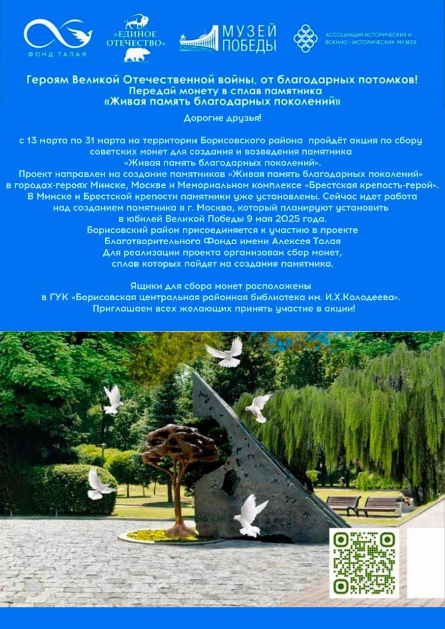 В рамках проекта «Живая память благодарных поколений» уже открыты две из трех скульптурных композиций - в 2022 году в г. Минске на набережной в Парке Победы (в Год исторической памяти) и в 2024 году в Брестской крепости рядом с молодежным патриотическим центром (к 80-летию освобождения Беларуси от немецко-фашистских захватчиков). Третий памятный знак еще не установлен и является завершающим проект «Живая память благодарных поколений» и будет открыт в г. Москве к юбилейному Дню Победы. Как и ранее в его сплав будут добавлены советские монеты от белорусов и россиян в знак благодарности поколению Победителей фашизма.