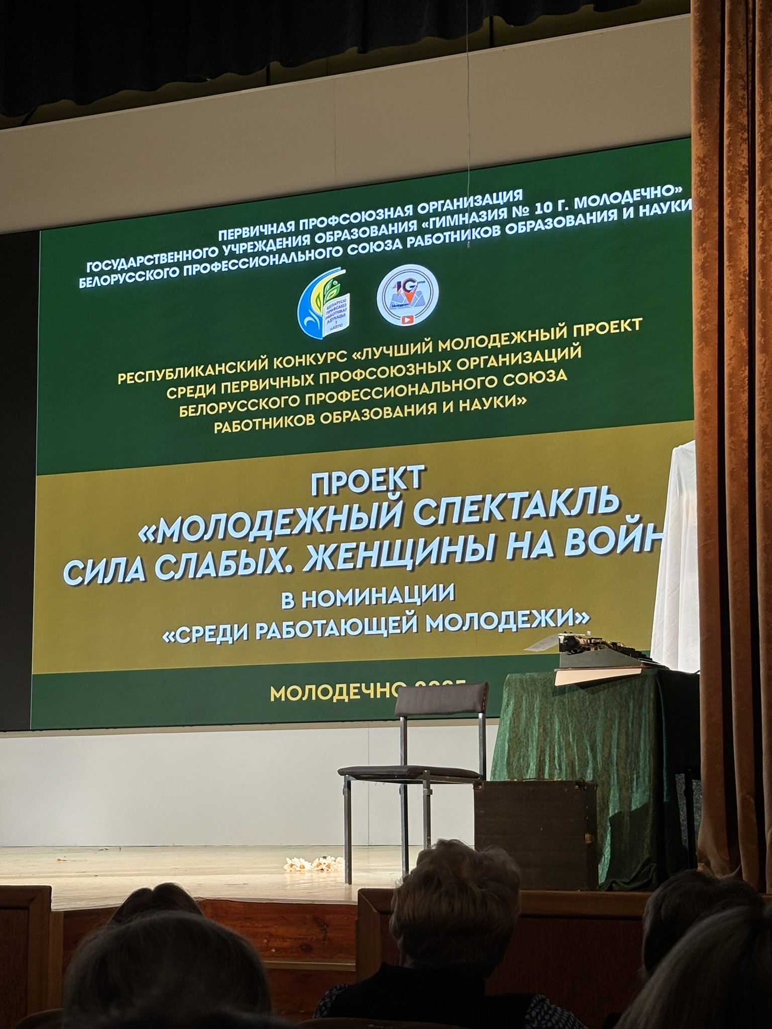 9 декабря в Международный день памяти жертв преступления геноцида, чествования их достоинства и предупреждения этого преступления, Минская областная организация Профсоюза образования и науки организовала торжественное мероприятие с проектами-победителями. Спектакль «Сила слабых. Женщины на войне» и «Песня».