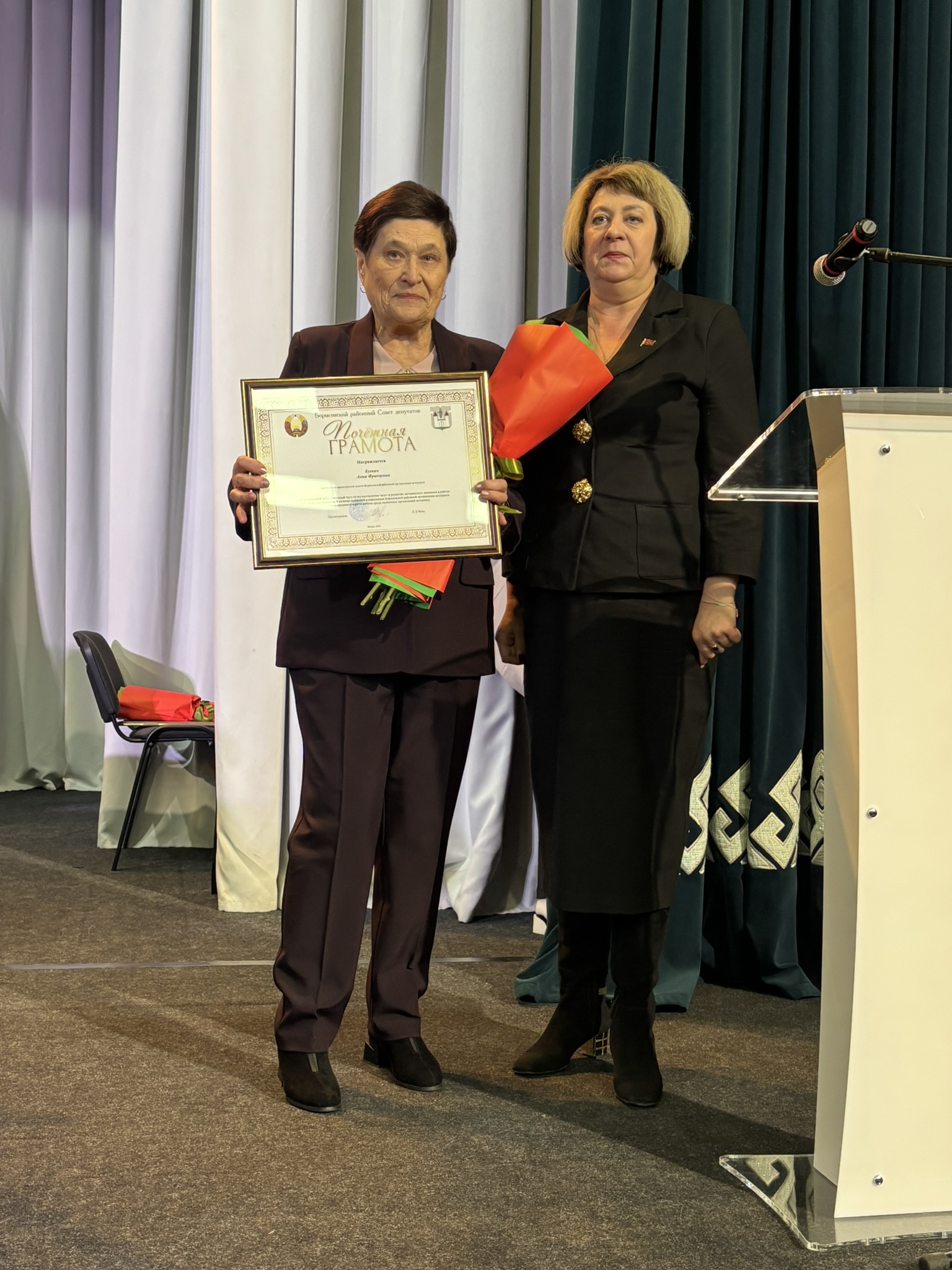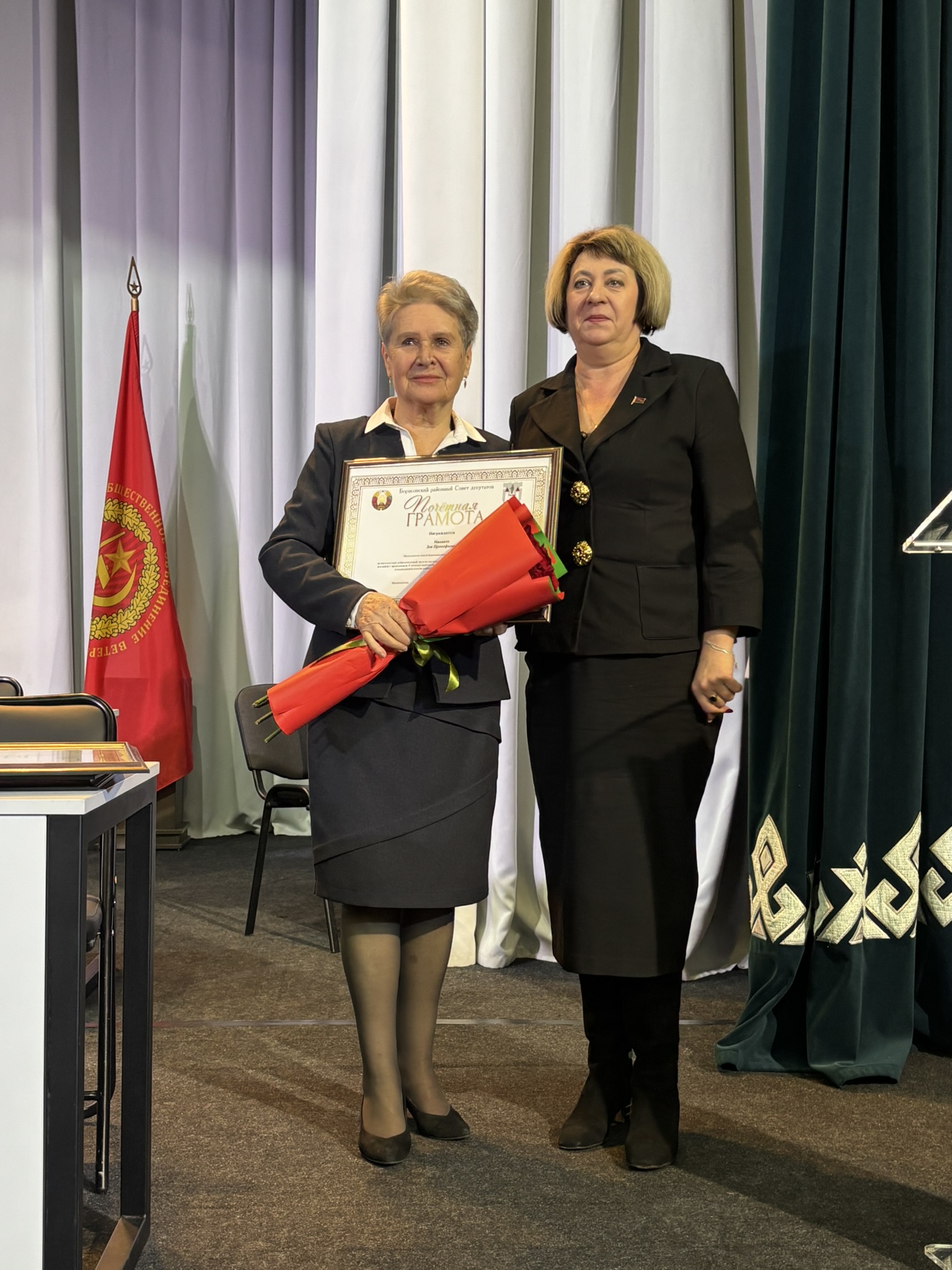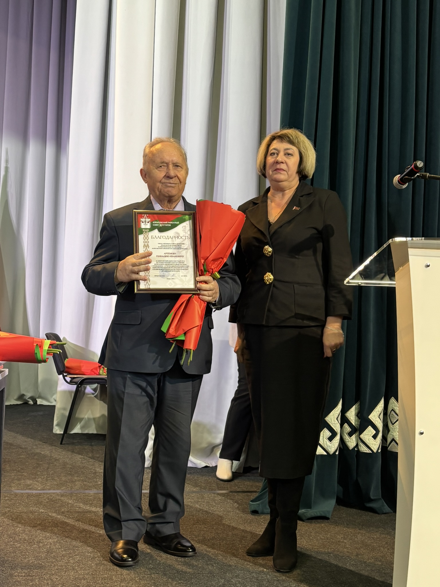 Заместитель председателя совета Минской областной организации ветеранов Регина Кузьмич поблагодарила Борисовскую районную организацию ветеранов и всех ее членов за достойный труд и активную деятельность, а также вручила заместителю председателя Борисовского районного совета ветеранов Анне Буевич нагрудный знак Белорусского общественного объединения ветеранов «За заслуги». Знака «Почетный ветеран» Белорусского общественного объединения ветеранов удостоены Тамара Холина и Николай Мешков.