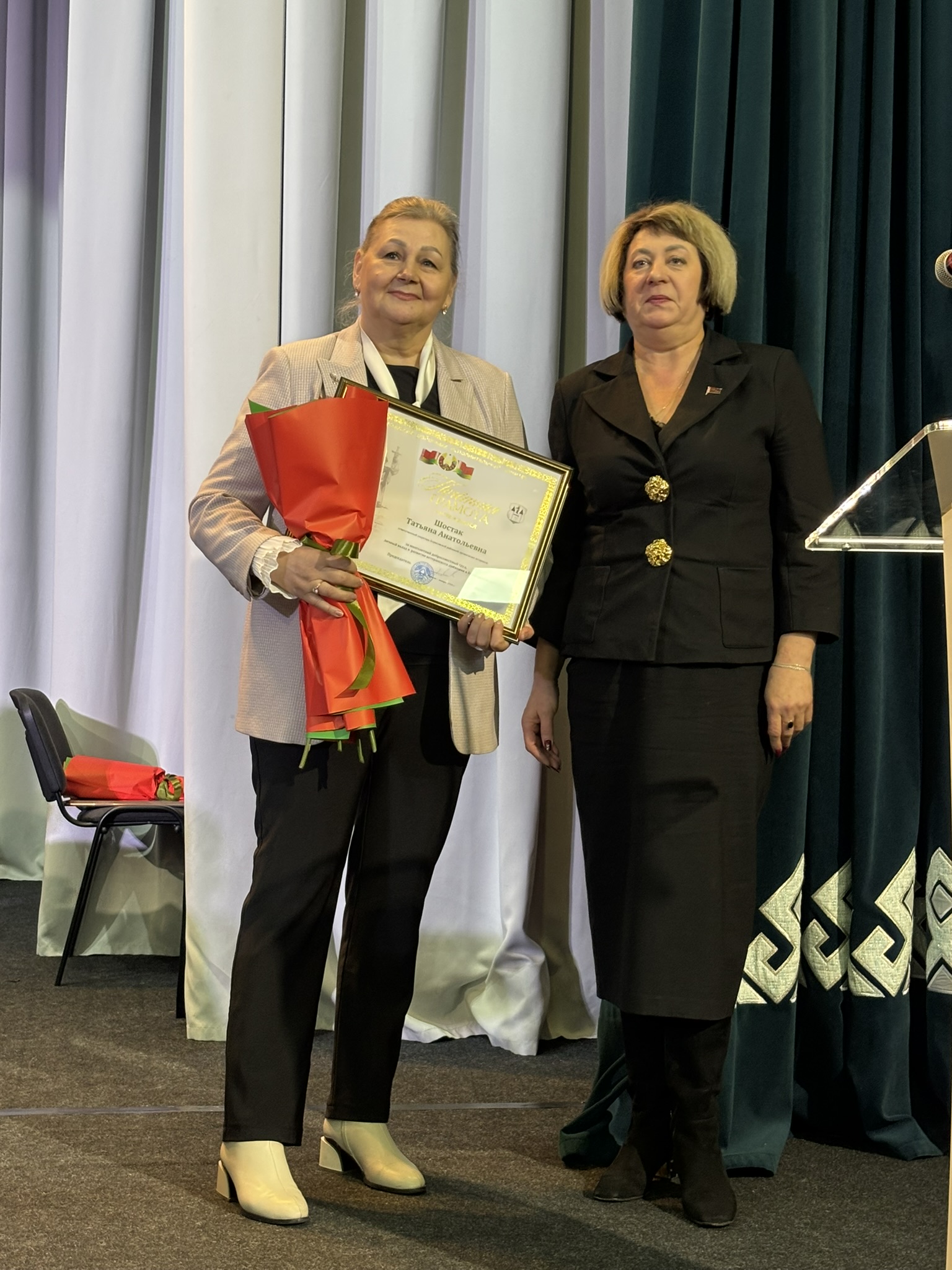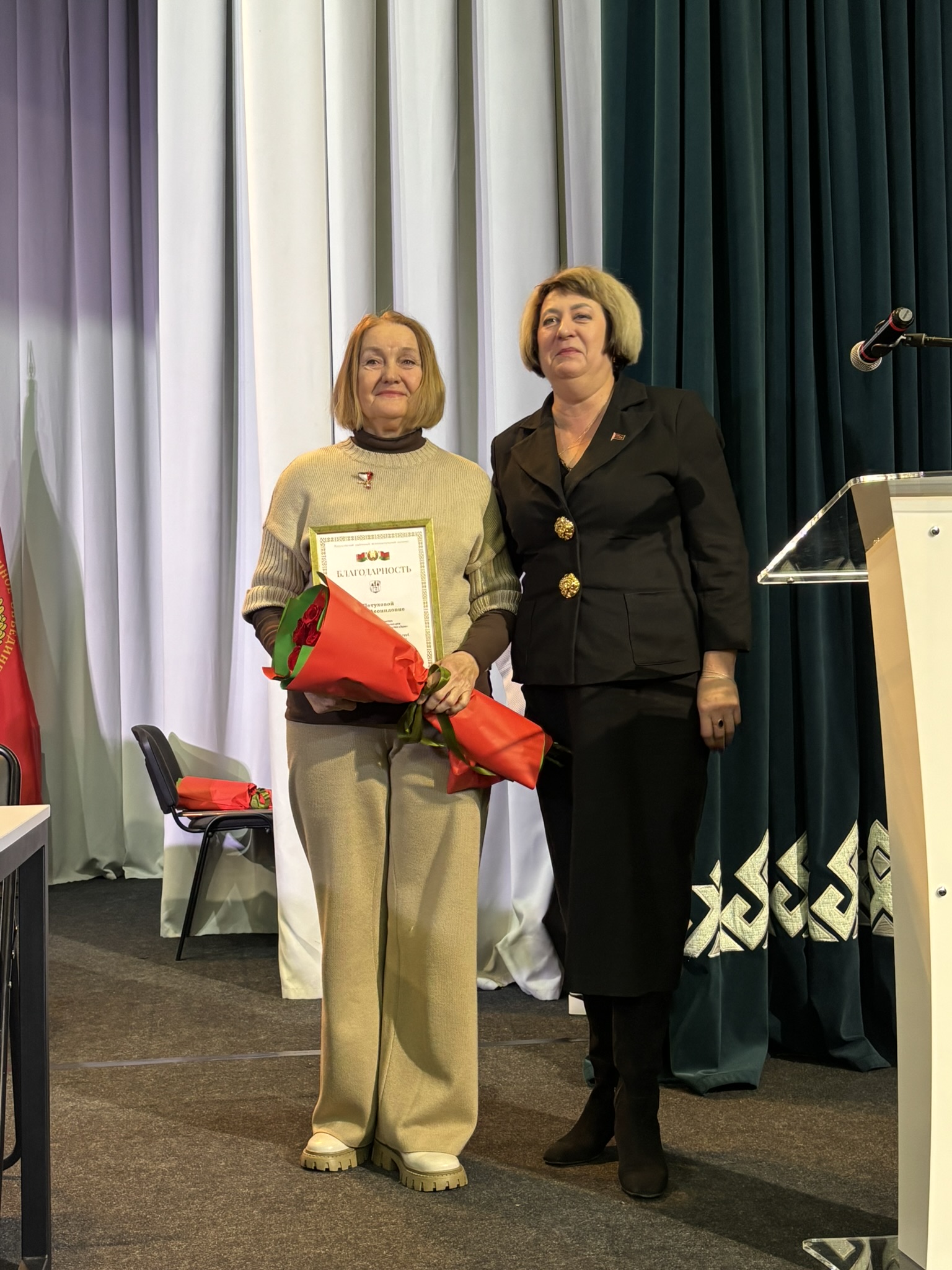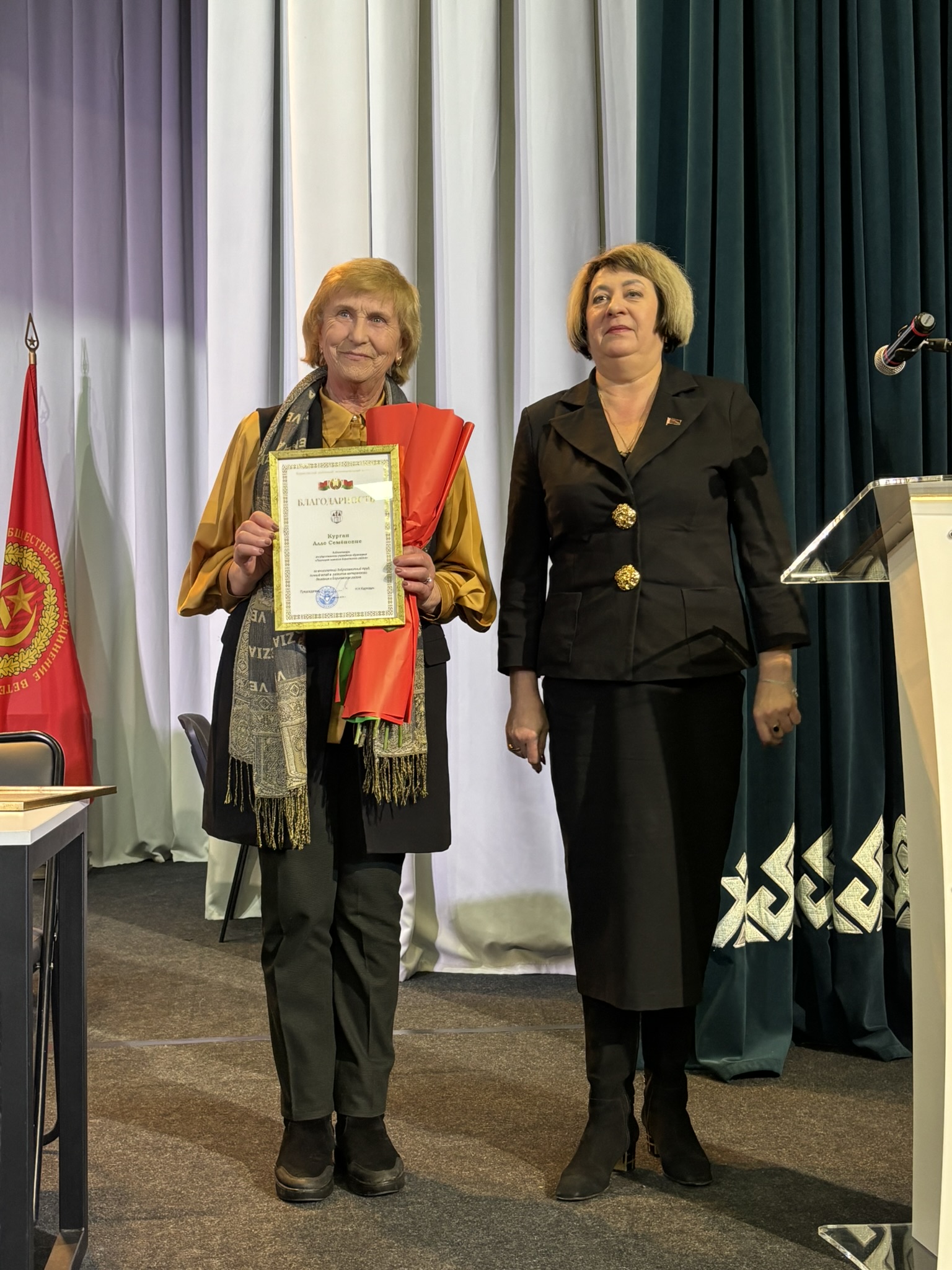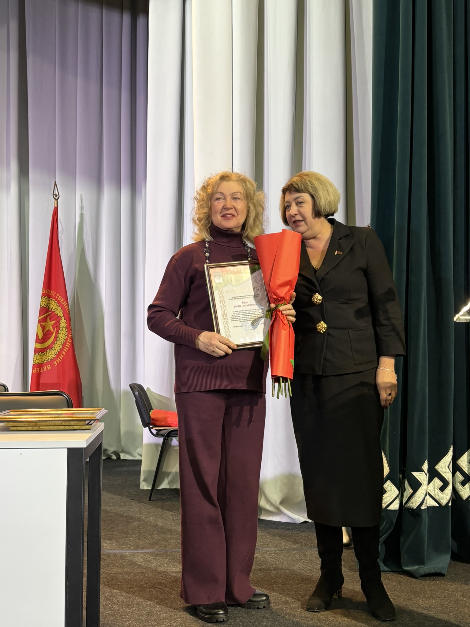 Заместитель председателя совета Минской областной организации ветеранов Регина Кузьмич поблагодарила Борисовскую районную организацию ветеранов и всех ее членов за достойный труд и активную деятельность, а также вручила заместителю председателя Борисовского районного совета ветеранов Анне Буевич нагрудный знак Белорусского общественного объединения ветеранов «За заслуги». Знака «Почетный ветеран» Белорусского общественного объединения ветеранов удостоены Тамара Холина и Николай Мешков.
